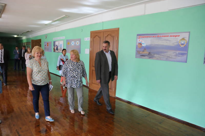 Далее рабочая группа Администрации города направилась в школу юнг, чтобы посмотреть готовность образовательного учреждения к новому учебному году. В классах еще идет побелка и покраска, а вот коридоры уже приведены в полную «боевую готовность»: паркет блестит новым лаком, стены чистые и украшены дидактическими материалами. Как сообщила директор Архангельской школы Соловецких юнг Ольга Павловцева, в этом году был также разработан и утвержден проект нового ограждения школы, которое установят следующим летом.