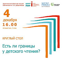 4 декабря в 16.00 в актовом зале Архангельской областной научной библиотеки им. Н.А. Добролюбова состоится круглый стол «Есть ли границы у детского чтения?» с участием писателей Жана-Филиппа Арру-Виньо (Франция), Анке Бер (Германия) и Елены Кузьминой, членом Архангельского регионального отделения союза писателей России.