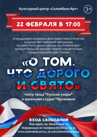 В преддверии праздника День защитника Отечества 22 февраля в 17.00 в рамках VII фестиваля творческой молодежи городов воинской славы и городов-героев России «Помним. Гордимся. Верим» на сцене КЦ «Соломбала-Арт» пройдет большой концерт «О том, что дорого и свято» творческой делегации города воинской славы Пскова.