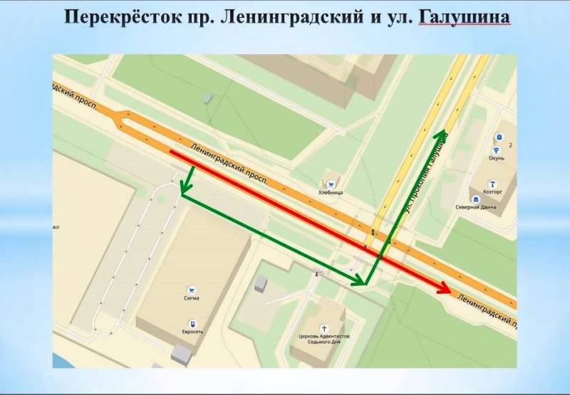Также общественники положительно оценили инициативу администрации по организации движения на перекрестке пр. Ленинградский и ул. Галушина в направлении из центра: предлагается установить знак «Движение прямо» на пр. Ленинградский, а поворот налево будет осуществляться по сопутствующей дороге вдоль ТЦ «Сигма».