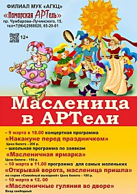 В филиале АГКЦ "Поморской АРТели" подготовили интересную программу на праздник проводов зимы - Масленицу. Уже 9 марта горожан ждут на театрализованную программу "Накануне перед праздничком".
