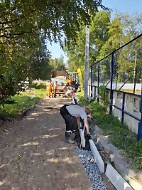 Идет разработка грунта. Производится укладка песка, устройство песчаного покрытия, прослойка дорнитом.