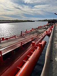 В прошлом году из-за течи в корпусе понтон не прошел плановое освидетельствование речного регистра, и переправа МЛП – 14 лесозавод не работала, а объездной путь по ледовой дороге оказался значительно длиннее. В течение нескольких месяцев администрация города прорабатывала различные варианты решения. Планы по проектированию и строительству нового понтона между 22 и 23 лесозаводами пока отложили из-за сжатых сроков и главное – в связи с выявленными проблемами по берегоукреплению и установке понтона на новом месте.