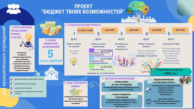 С 1 ноября до 1 декабря 2022 года идёт этап подачи заявок на участие, направленных на развитие муниципальных учреждений города. Подробности об этапах проекта вы можете в группе Бюджет твоих возможностей и инициативные проекты и на сайте Департамента финансов в разделе "Бюджет твоих возможностей".