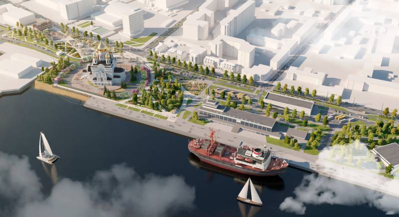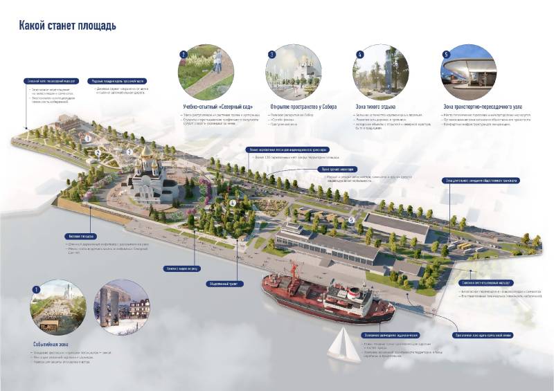 На площади появятся три новые функциональные зоны. Это событийная площадь перед зданием Сурского подворья с площадкой для проведения массовых мероприятий и зимним катком. Ближе к собору создадут амфитеатр с видом на Северную Двину, облагородят здесь и зеленую территорию. В зоне транспортно-пересадочного узла появятся крытые автобусные остановки, павильон для проката спортивного инвентаря с кофе-точкой.