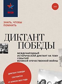 Международная акция "Диктант Победы" пройдёт для всех желающих 27 апреля 2023 года. Это уникальная патриотическая акция, центральной задачей которой является привлечение всеобщего, пристального внимания к сохранению и увековечиванию подвига нашего народа в Великой Отечественной войне, представляет собой тест из вопросов, ответив на которые участники могут максимально проявить и проверить свои знания о различных событиях Великой Отечественной войны и её ходе в целом.