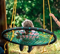 Во дворе на Лахтинском шоссе, 18 несколько иной набор элементов: односекционные качели и качели «Гнездо», песочный дворик с горкой, детский спортивный комплекс, качалка-балансир и игровая форма-машинка.