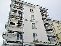 На дом № 95 новый подрядчик зашел четыре дня назад. Специалисты занимаются капремонтом бокового фасада, непосредственно примыкающего к площади Мира.