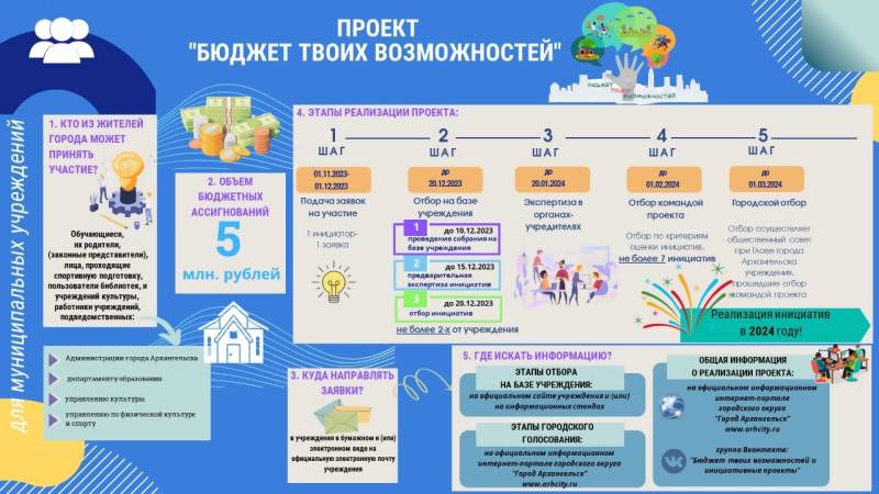 "Бюджет твоих возможностей" - это проект, направленный на развитие материально-технической базы муниципальных учреждений, на развитие их территорий, на организацию массовых мероприятий.