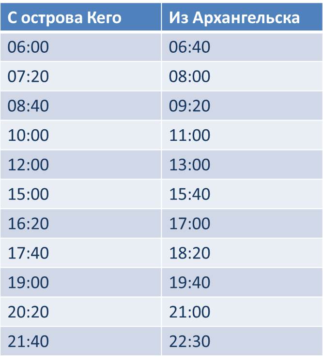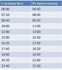 Так, рейс с о. Кего с 11.00 перенесен на 10.00. Из Архангельска рейс с 10.20 перенесен на 9.20, с 11.30 на 11.00.