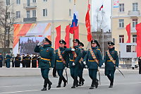 Флаг Российской Федерации и легендарное знамя Победы на площадь внесла знаменная группа Главного управления МЧС России по Архангельской области.