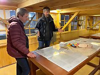 На верфи Мосеева острова глава города Дмитрий Морев и руководитель Фонда возрождения деревянного судостроения Глеб Плетнев обсудили возможность изготовления такого катера-экспоната для украшения благоустроенной набережной Соломбалки.