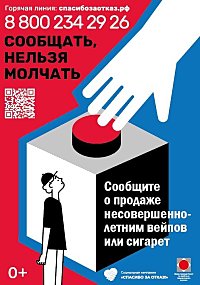 В рамках акции работает «горячая линия». По телефону 8 800 234 29 26 или через сайт спасибозаотказ.рф/ можно сообщить о торговых точках, где подросткам продают табачную и никотиносодержащую продукцию.