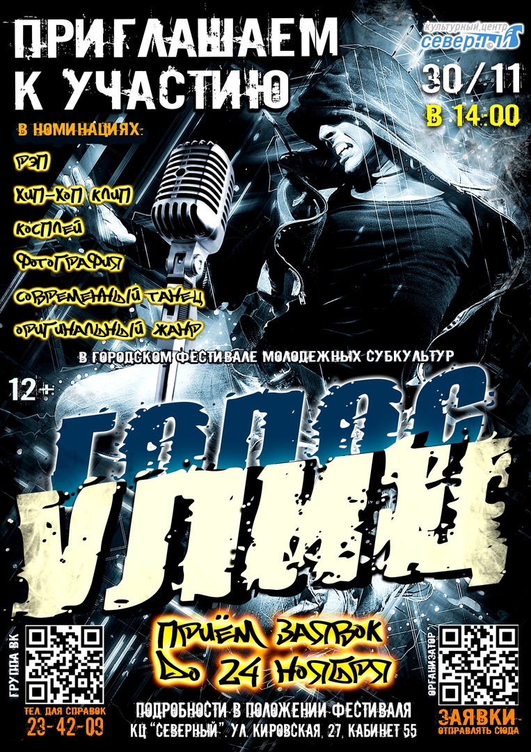 Конкурс проводится по следующим номинациям: «Рэп», «Хип-хоп-клип», «Современный танец», «Косплей», «Оригинальный жанр» и «Фотография». Для участия в фестивале необходимо до 24 ноября до 18 часов подать заявку в КЦ «Северный».