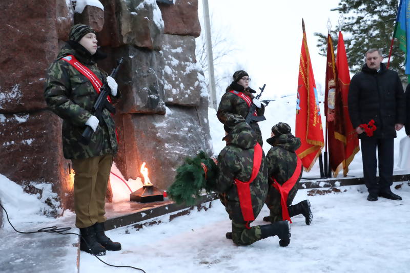 В ходе мероприятия его участники почтили минутой молчания память павших земляков. После этого под мелодию песни «Журавли» в небо были запущены белые шары, а к подножию мемориала легла еловая гирлянда. Завершилось все возложением красных гвоздик к плитам с именами погибших воинов.