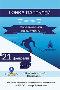 На лыжно - биатлонном комплексе Центра "Архангел" острова Краснофлотский 21 февраля состоятся Архангельские городские соревнования по биатлону "Гонка Патрулей".