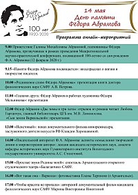 День памяти откроет видеоприветствие Галины Михайловны Абрамовой, племянницы Фёдора Абрамова, прозвучавшее в рамках проведения Межрегиональной научно-практической конференции, посвященной 100-летию со дня рождения Ф.А. Абрамова