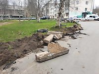 По ул. Гагарина, 14, корпус 1 подрядчик ООО «Авагрупп» приступил к демонтажу бордюрного камня.