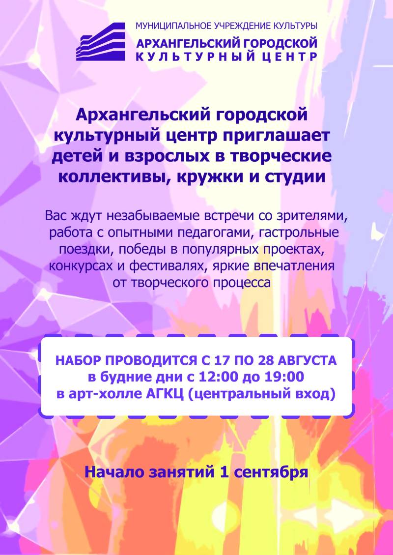 Архангельский городской культурный центр приглашает детей и взрослых в творческие коллективы, кружки и студии.