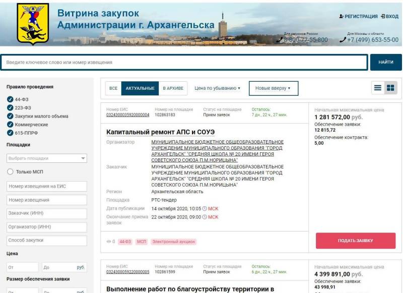 На сайте администрации Архангельска создана отдельная рубрика – «Витрина закупок». Всю информацию о торговых процедурах и контрактах можно посмотреть на главной странице сайта в специальном разделе.Информационная вкладка создана для реализации принципа открытости и прозрачности закупок и позволяет на одном ресурсе объединить все закупки Архангельска, заказчика или уполномоченного органа, размещенные в Единой информационной системе, а также во внутренних системах заказчика.