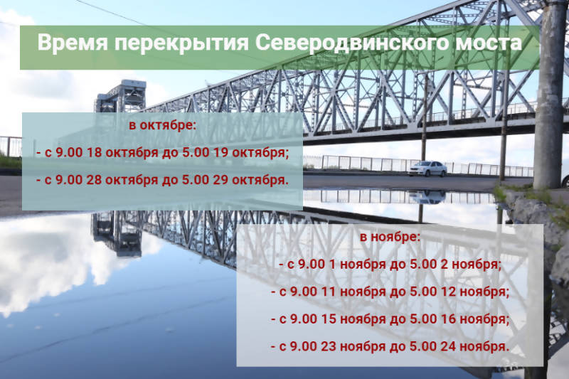 На совмещенном мостовом переходе через реку Северная Двина продолжаются работы в рамках капитального ремонта Северодвинского моста. В воскресенье, 18 октября, мост будет закрыт в 9 утра. Движение должно возобновиться в 5 утра 19 октября (понедельник).Без крайней необходимости не стоит в воскресенье ехать на левый берег или с левого берега - прогнозируется затруднение движения по Краснофлотскому мосту и на подъездах к нему.