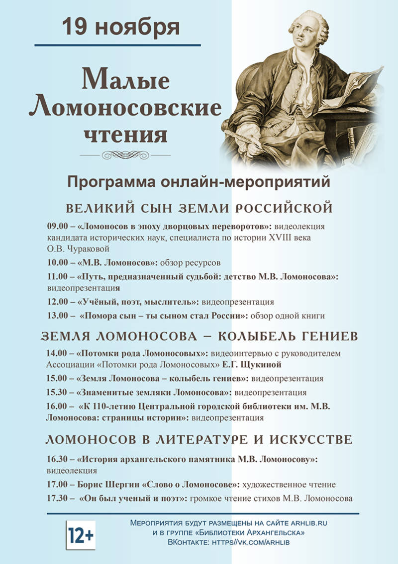 19 ноября, в день рождения русского учёного-энциклопедиста М.В. Ломоносова, Центральная городская библиотека им. М.В. Ломоносова инициирует проведение Малых Ломоносовских чтений, которые пройдут в онлайн-формате.