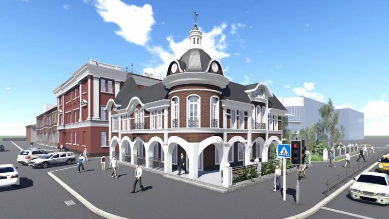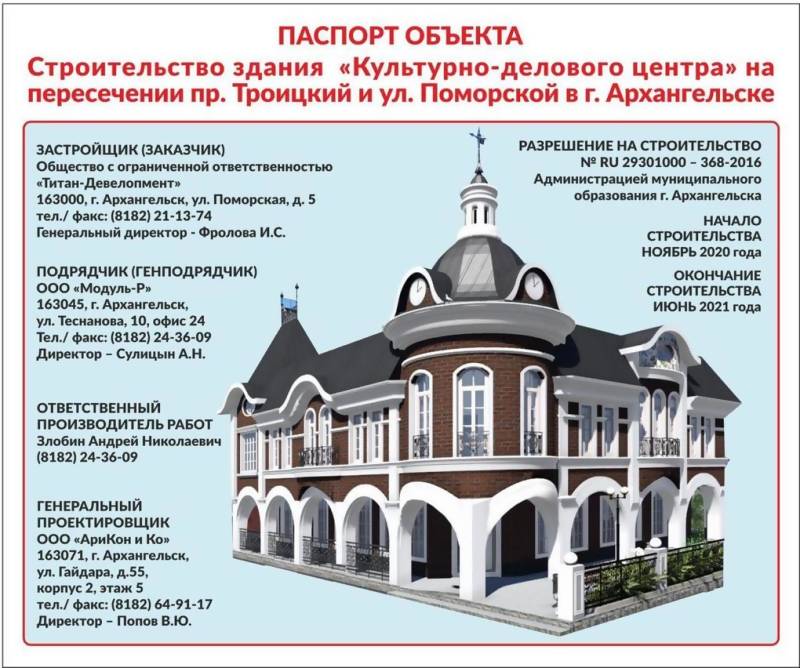 Здание, внешний вид которого соответствует архитектурной концепции исторической застройки, появится на перекрестке проспекта Троицкого и улицы Поморской — на месте бывшего торгового дома купца Сергеева.На фасаде здания будут использованы архитектурные мотивы застройки Архангельска конца XIX-го начала XX веков: арки, пилястры, карнизы, кованые решетки. На кровле угловой башни центра разместятся часы, подчеркивающие исторически-деловое назначение здания и связь с ранее расположенной на этом месте часовой мастерской.