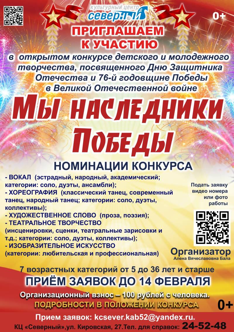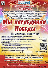 С 1 февраля принимаются заявки на Открытый конкурс, посвящённый Дню защитника Отечества и 76–й годовщине Победы в Великой Отечественной войне.Конкурс «Мы наследники Победы» проводится по следующим номинациям: