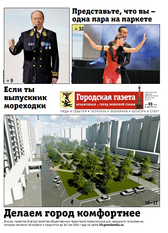 Главные темы номера: Делаем город комфортнее – вниманию читателей эскизы проектов благоустройства общественных территорий Архангельска для народного голосования, которое начнется 26 апреля и продлится до 30 мая 2021 года на сайте 29.gorodsreda.ru.