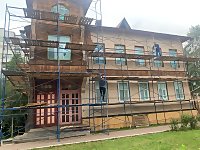 Рабочие обновляют не только фасады, но и декоративные элементы. Покраска ведется тремя цветовыми решениями: серо-голубой, бежево-бордовый и бежево-коричневый.