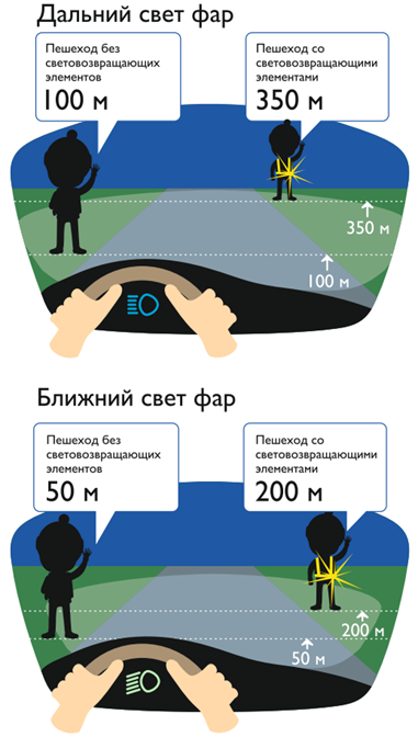 Световозвращающие элементы повышают видимость пешеходов на неосвещенной дороге и значительно снижают риск возникновения дорожно-транспортных происшествий с их участием. При движении с ближним светом фар водитель автомобиля способен увидеть пешехода на дороге на расстоянии 25-50 метров. Если пешеход применяет световозвращатель, то это расстояние увеличивается до 150-200 метров. А при движении автомобиля с дальним светом фар дистанция, на которой пешеход становится виден, с применением световозвращателей увеличивается со 100 метров до 350 метров. Это даёт водителю 15-25 секунд для принятия решения.