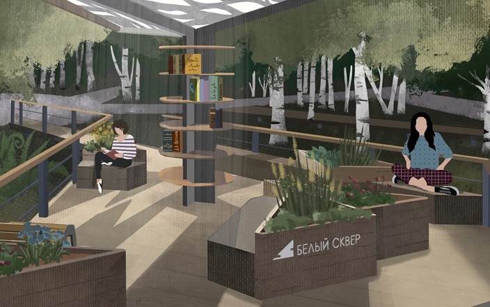 Проектом предусмотрено обустройство центральной аллеи, создание двух зон отдыха, украшенных малыми формами. Рядом с библиотекой разместится пространство, напоминающее открытую веранду летнего кафе.