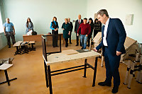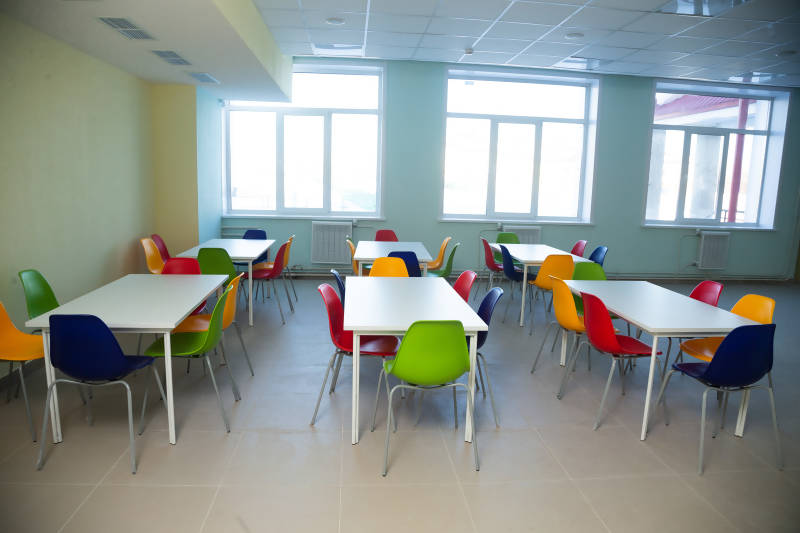 На сегодняшний день в новую школу поставлено порядка 50% оборудования, идет его установка, сборка мебели. Яркие разноцветные стулья и диваны, функциональные парты – все выглядит очень современно. Например, в кабинетах труда для девочек есть примерочная, профессиональный стол закройщика и столы-трансфоремеры для швейных машинок. Станки для отработки практических навыков установят и в классе технологии для мальчиков.