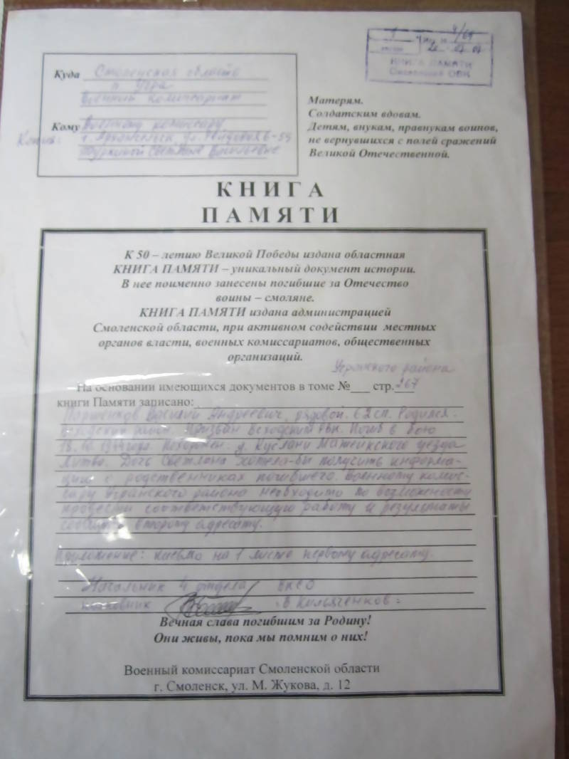 К 50-летию Победы на Смоленщине была издана областная «Книга Памяти – уникальный документ истории», в которую он так же был занесен.