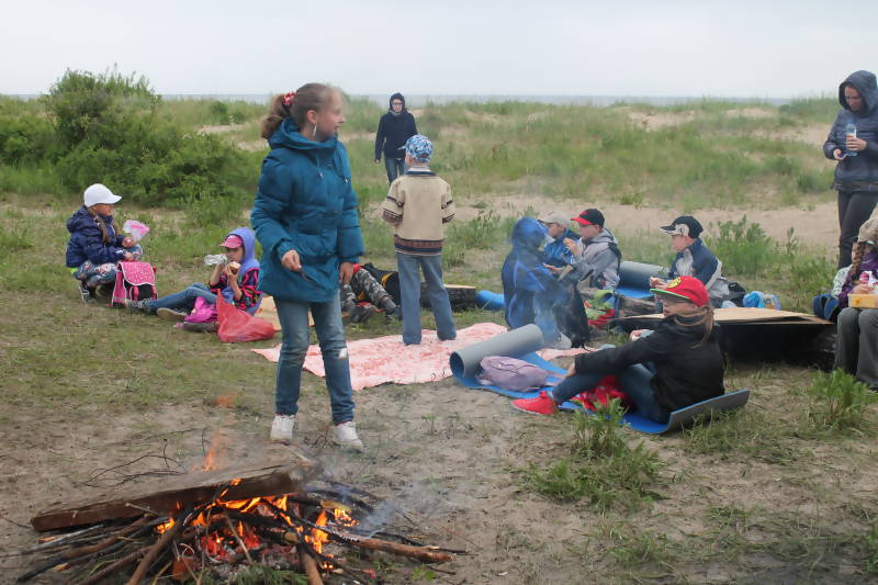 15 июня 2015 дети ДОЛ «Радуга» МБУ "Центр охраны прав детства" отдыхали на Белом море о. Ягры. Погода выдалась пасмурная, дождливая и холодная, но ребят это не испугало и не смутило. В первую очередь было решено разжечь костер, и дети активно принялись собирать хворост.