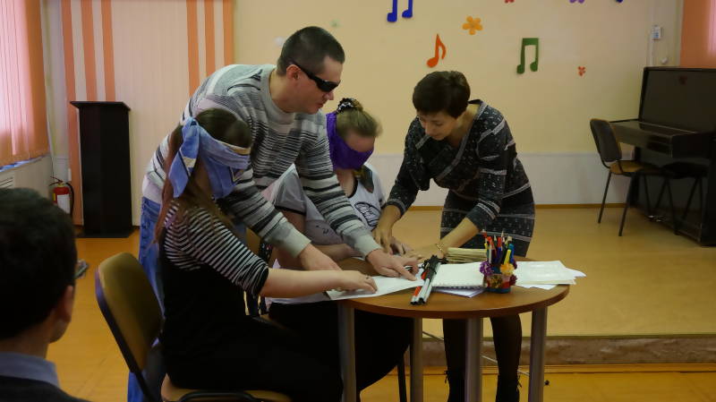 На встрече, проходившей в рамках месячника «Белая трость», подопечные познакомились со средствами реабилитации для слабовидящих и слепых людей. Попробовали сами «посмотреть» картинки на ощупь и почитать специализированные книги. Не просто оказалось, и пройти по комнате с  закрытыми глазами с помощью трости. Интересно взглянуть на мир глазами другого человека, а нашим подопечным удалось на себе ощутить все сложности невидящих людей. Подобные встречи учат наших особенных подопечных сопереживать и лучше понимать окружающих.