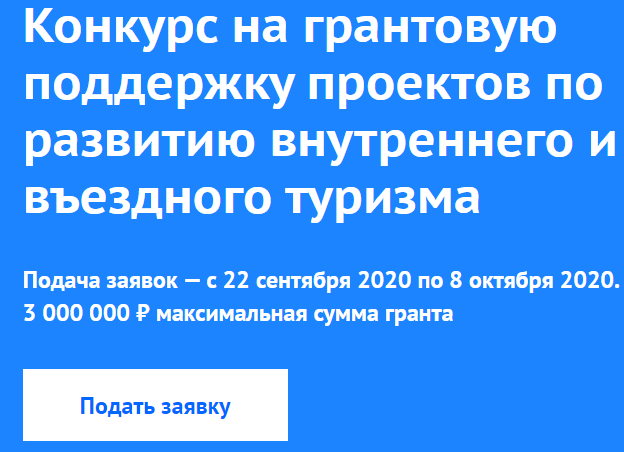 Ростуризм объявил о приеме заявок на получение грантов на развитие внутреннего и въездного туризма. Это новая мера поддержки в туристической отрасли. На ее реализацию правительство выделило субсидию в размере 1,2 млрд рублей. Ожидается, что поддержку получат не менее 400 проектов.
