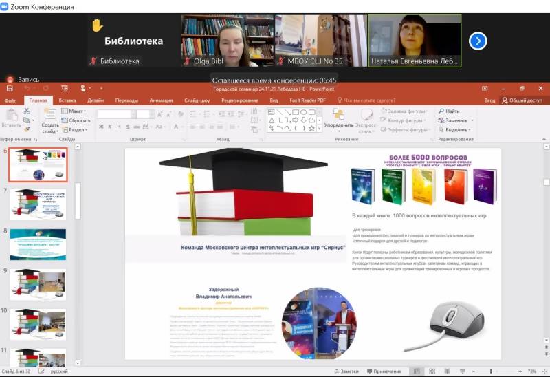 24 ноября 2021 года состоялся семинар для работников библиотек образовательных учреждений в рамках работы опорного учреждения системы образования городского округа "Город Архангельск" по направлению "Методическое сопровождение библиотечных работников образовательных организаций города Архангельска в условиях формирования цифровой образовательной среды в школе" (МБОУ СШ № 35). Мероприятие проведено в формате вебинара на платформе Zoom. В мероприятии приняли участие 25 школьных библиотекарей.