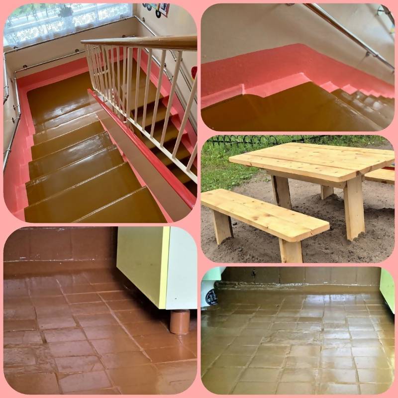 Сотрудники и родители воспитанников кроме текущих ремонтных работ (покраска лестничных маршей и туалетных комнат, частичная покраска пищеблока, косметический ремонт групповых помещений) большое внимание уделили территории детского сада: установлены новые и окрашены имеющиеся малые архитектурные формы, облагорожены прогулочные участки.