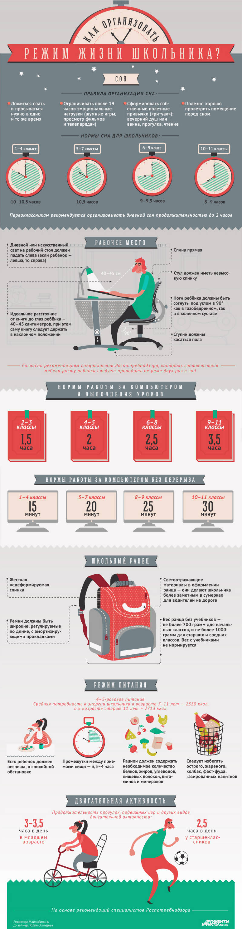 По мнению специалистов, главное влияние на состояние здоровья учащихся оказывают количество и качество сна, питание и двигательная активность. При недостатке сна у детей может нарушаться поступление в кровь специфических гормонов, что отрицательно сказывается на их росте и развитии, а также на способности к обучению.