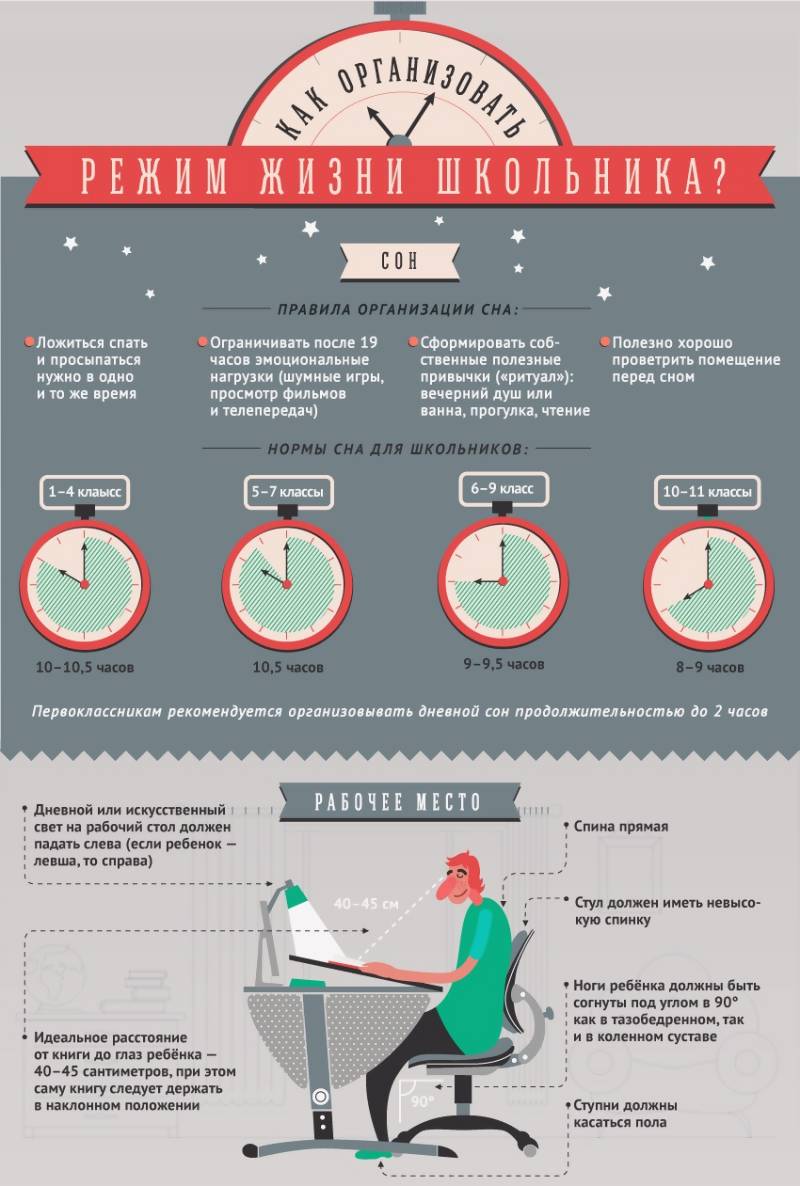 Роспотребнадзор приводит примерные нормы сна: в 1–4 классе норма составляет 10–10,5 часа, 5–7 классах - 10,5 часа, 6–9 классах - 9–9,5 часа, в старших классах школьникам необходимо спать по 8–9 часов.