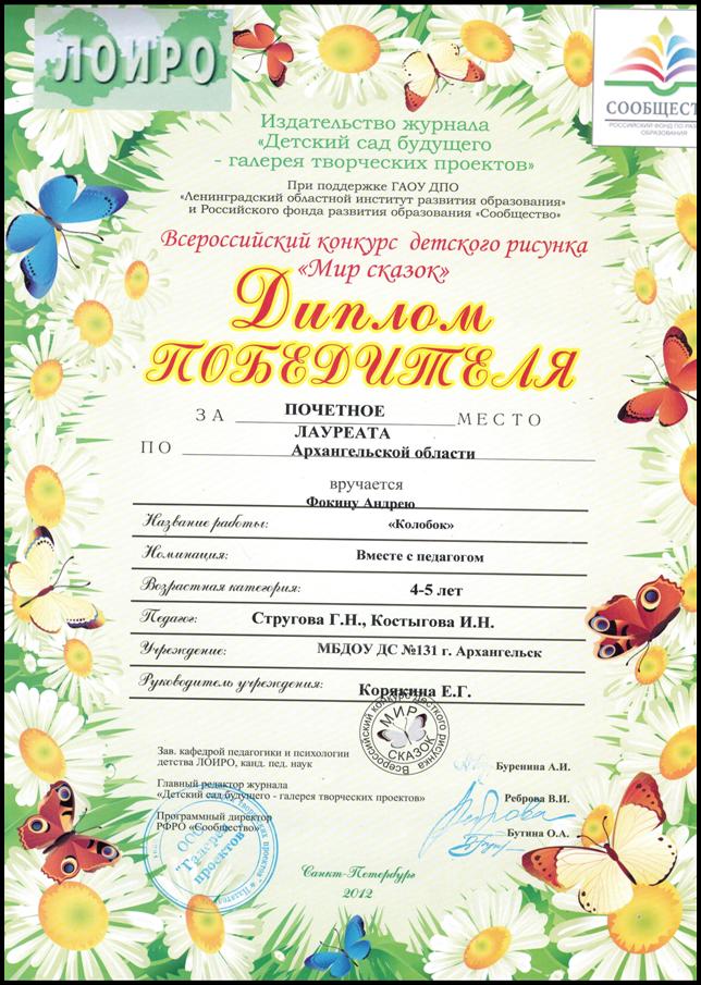 Творческие работы  "Сказка о рыбаке и рыбке" Кузнецова Никиты и  "Колобок" Фокина Андрея награждены дипломами победителей.