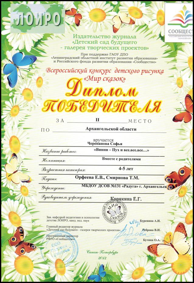Работа  "Винни - Пух и все, все, все" Черепановой Софьи заняла II место по Архангельской области.
