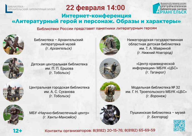 Модельная Библиотека – Архангельский литературный музей 22 февраля 2024 года в 14 часов по московскому времени инициирует проведение интернет-конференции городов, имеющих памятники литературным героям.