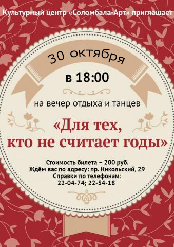 30 октября в культурном центре «Соломбала-Арт» вновь состоится вечер отдыха «Для тех, кто не считает годы».