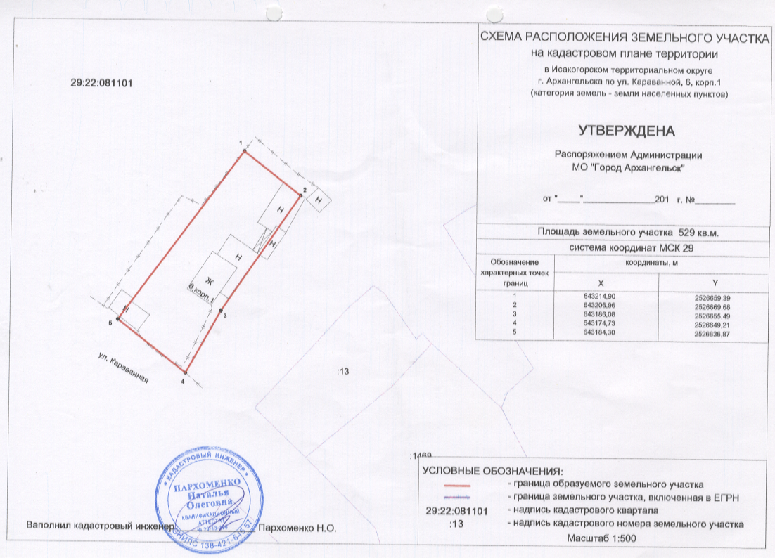 2.                 Отказать в утверждении схемы расположения земельного участка в кадастровом квартале 29:22:081101 площадью 529 кв.м, расположенного в Исакогорском территориальном округе г.Архангельска по ул. Караванной, в границах территориальной зоны малоэтажных многоквартирных и среднеэтажных жилых домов Ж-7согласно Правилам землепользования и застройки муниципального образования "Город Архангельск" (категория земель – земли населенных пунктов) для эксплуатации индивидуального жилого дома (для индивидуального жилищного строительства).