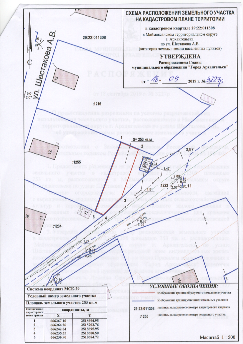 2. Утвердить схему прилагаемую расположения земельного участка в кадастровом квартале 29:22:011308 площадью 253 кв.м, расположенного в Маймаксанском территориальном округе г.Архангельска по улице Шестакова А.В., в границах территориальной зоны индивидуальных жилых домов с приусадебными участками Ж-1 согласно Правилам землепользования и застройки муниципального образования "Город Архангельск" (категория земель – земли населенных пунктов) для ведения огородничества.