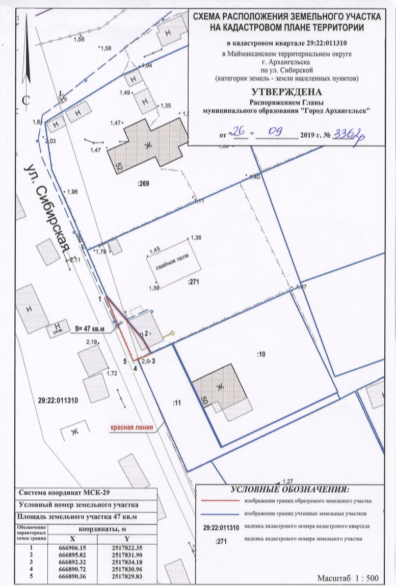 Распоряжение от 26 сентября 2019 г. № 3362р "О предоставлении разрешения на условно разрешенный вид использования земельного участка, расположенного в Маймаксанском территориальном округе г.Архангельска по улице Сибирской, об утверждении схемы расположения земельного участка"