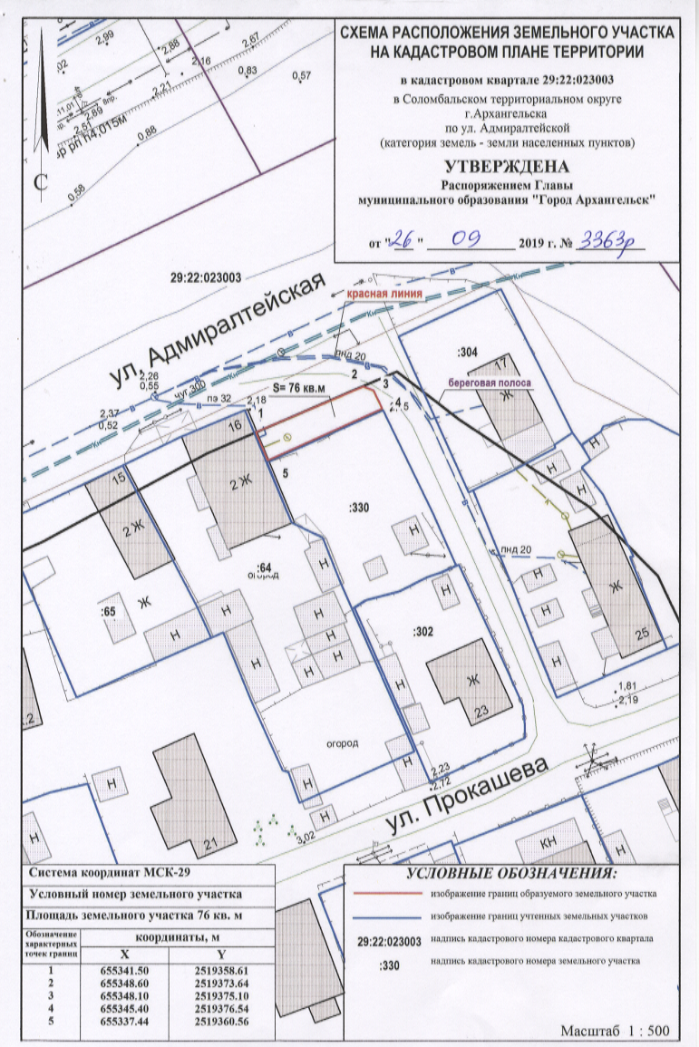 2. Утвердить прилагаемую схему расположения земельного участка в кадастровом квартале 29:22:023003 площадью 76 кв.м, расположенного в Соломбальском территориальном округе г.Архангельска по улице Адмиралтейской, в границах территориальной зоны индивидуальных жилых домов с приусадебными участками и малоэтажных многоквартирных жилых домов Ж-5 согласно Правилам землепользования и застройки муниципального образования "Город Архангельск" (категория земель – земли населенных пунктов) для ведения личного подсобного хозяйства.