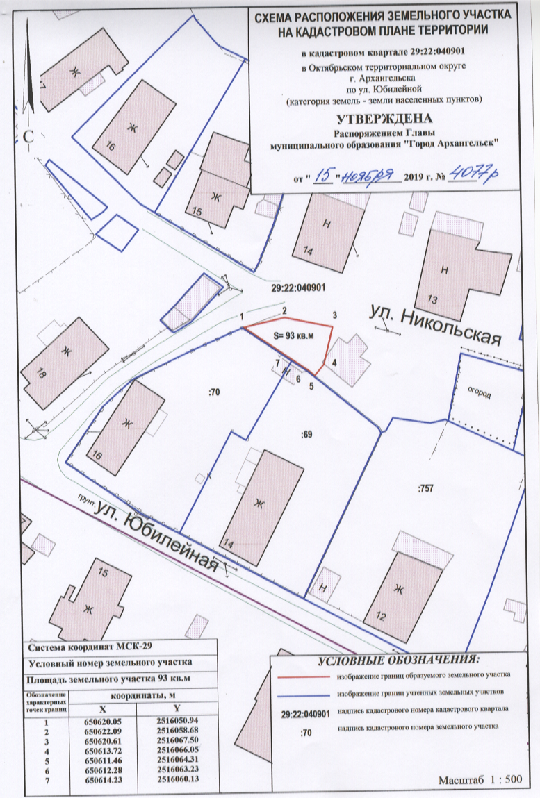 2. Утвердить прилагаемую схему расположения земельного участка в кадастровом квартале 29:22:040901 площадью 93 кв.м, расположенного в Октябрьском территориальном округе г.Архангельска по улице Юбилейной, в границах территориальной зоны индивидуальных жилых домов с приусадебными участками и малоэтажных многоквартирных жилых домовЖ-5согласно Правилам землепользования и застройки муниципального образования "Город Архангельск" (категория земель – земли населенных пунктов) видом разрешенного использования для ведения огородничества.